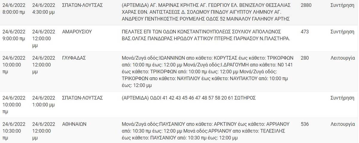 Σε 11 περιοχές της Αττικής θα σημειωθεί την Παρασκευή 24 Ιουνίου προγραμματισμένη διακοπή ρεύματος