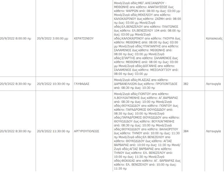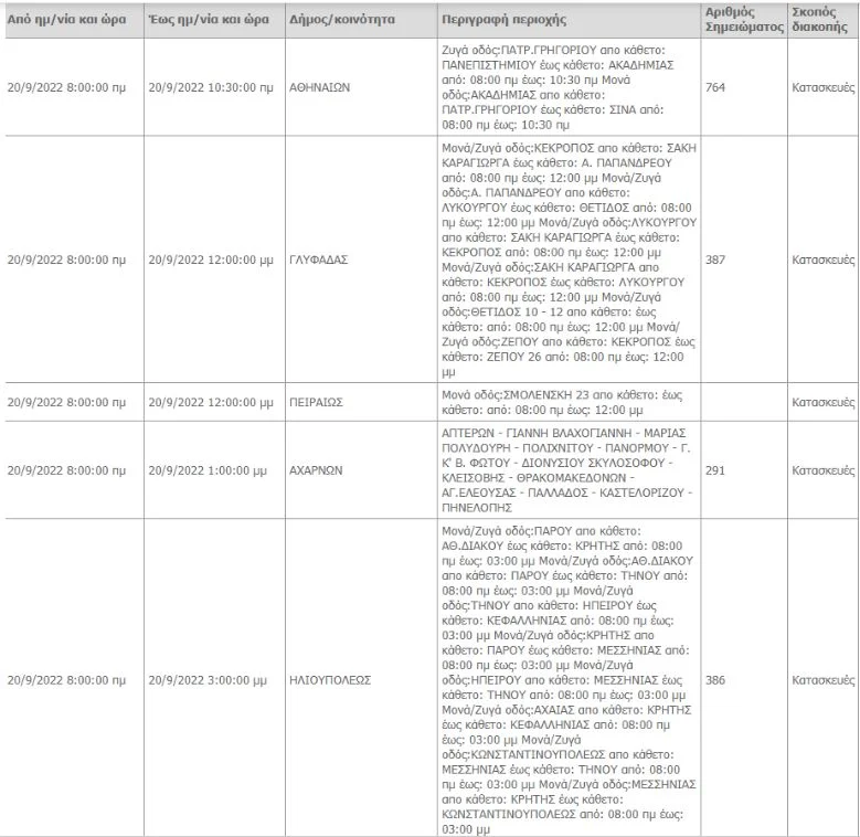 Οι περιοχές που θα επηρεαστούν είναι οι εξής: