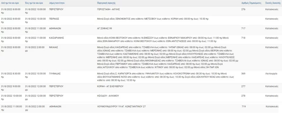 Ο πίνακας με τις διακοπές ηλεκτροδότησης