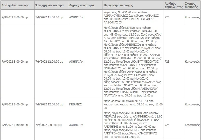 Δείτε τον πίνακα με τις διακοπές ηλεκτροδότησης:
