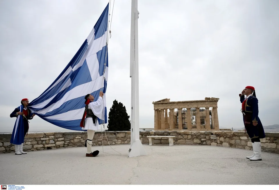 Όσοι βρέθηκαν το πρωί της Τρίτης στην Ακρόπολη, είχαν την ευκαιρία να παρακολουθήσουν τους Εύζωνες της Προεδρικής Φρουράς να υψώνουν τη σημαία στον ιστό, ενώ η μπάντα του Λιμενικού Σώματος απέδωσε τον εθνικό ύμνο.
