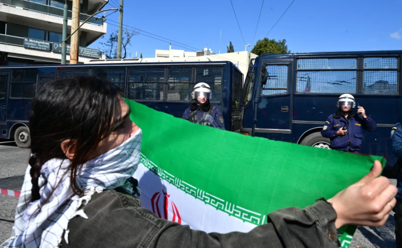 Διαδήλωση έλαβε χώρα το μεσημέρι της Κυριακής (01/3) έξω από την αμερικανική πρεσβεία, λόγω της αμερικανοϊσραηλινής επίθεσης κατά του Ιράν.