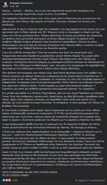 Υπενθυμίζεται πως ο κ. Αντώναρος μεταφέρθηκε εσπευσμένα με C-130 από την Πάτμο στην Κρήτη, αναφέροντας πως αν δεν είχε ληφθεί άμεσα και έγκαιρα η απόφαση για αεροδιακομιδή, «δεν ξέρω ούτε πού ούτε πώς θα ήμουν τώρα», επαινώντας παράλληλα την εξαιρετική δουλειά που κάνουν οι γιατροί στο νησί.