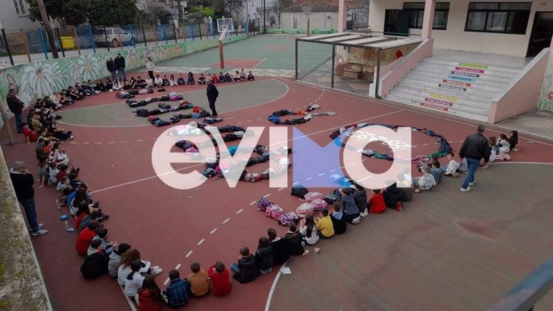 Από τη Χαλκίδα μέχρι το Αλιβέρι, τα παιδιά συγκεντρώνονται στα προαύλια των σχολείων τους και σχηματίζουν με τα σώματα, τα ρούχα και τις τσάντες το μήνυμα που προκαλεί ανατριχίλα και δέος.