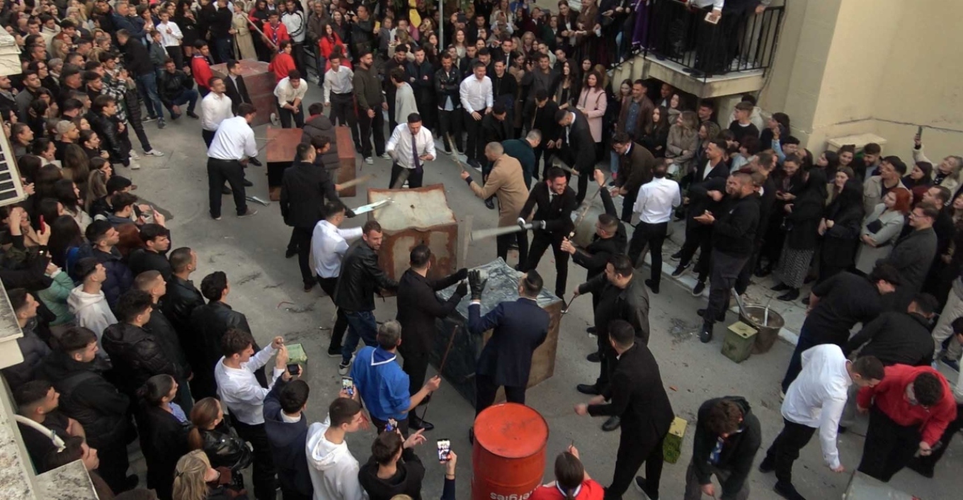 Για να ενισχυθεί το δραματικό στοιχείο της αναπαράστασης, πιστοί και μέλη της εκκλησίας μεταφέρουν έξω από τον ναό μεγάλους σιδερένιους ντενεκέδες. Εκεί αρχίζουν να τους χτυπούν δυνατά με μεταλλικές ράβδους, δημιουργώντας έναν εκκωφαντικό θόρυβο.