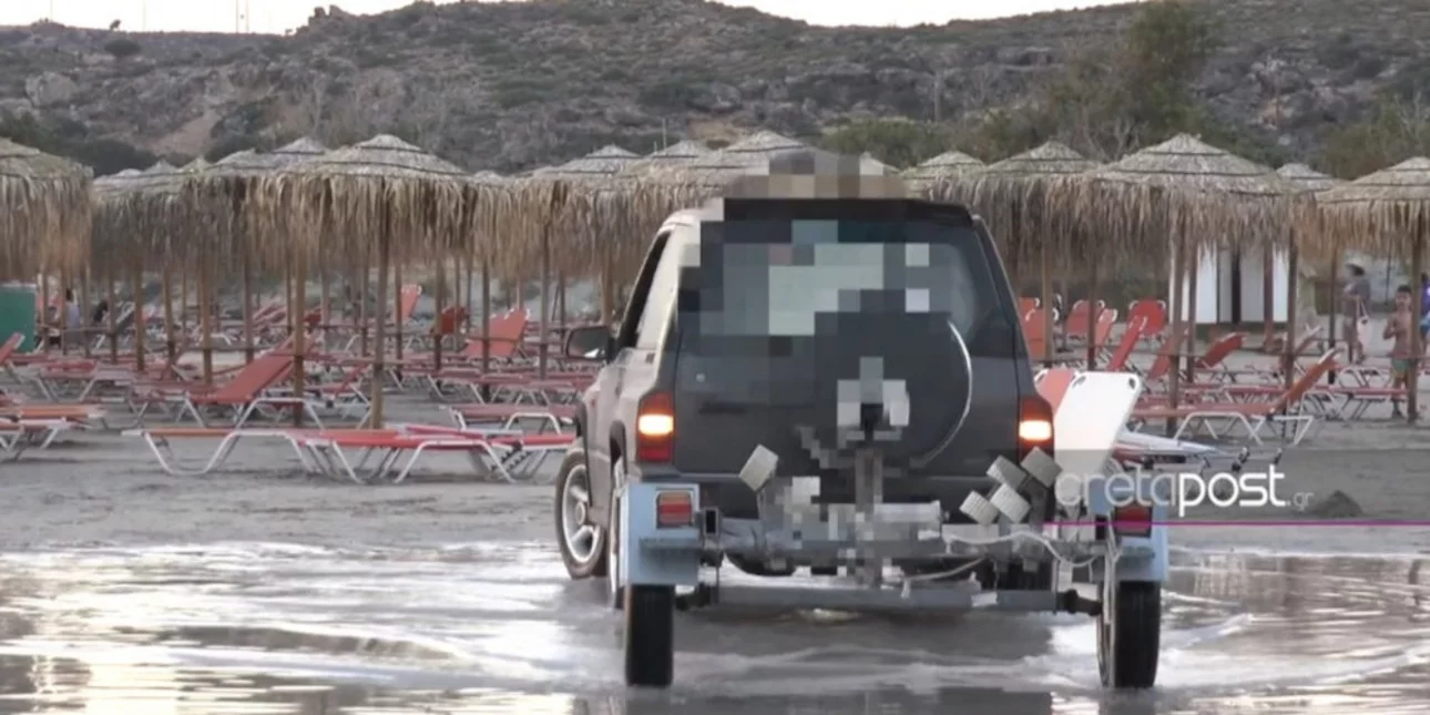Μετά από τις ξαπλώστρες λοιπόν, έκανε την εμφάνισή του κι ένα τζιπ στην παραλία, το οποίο ρυμουλκούσε και ένα τρέιλερ.