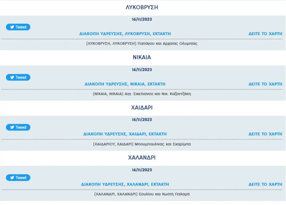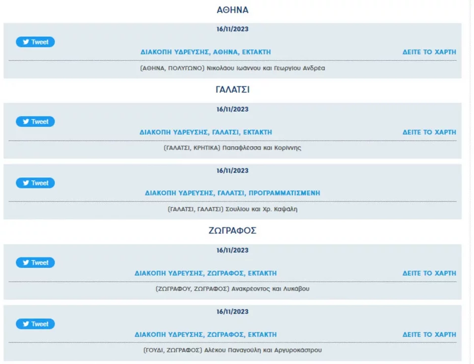Οι περιοχές που θα σημειωθεί διακοπή υδροδότησης σήμερα είναι οι εξής: