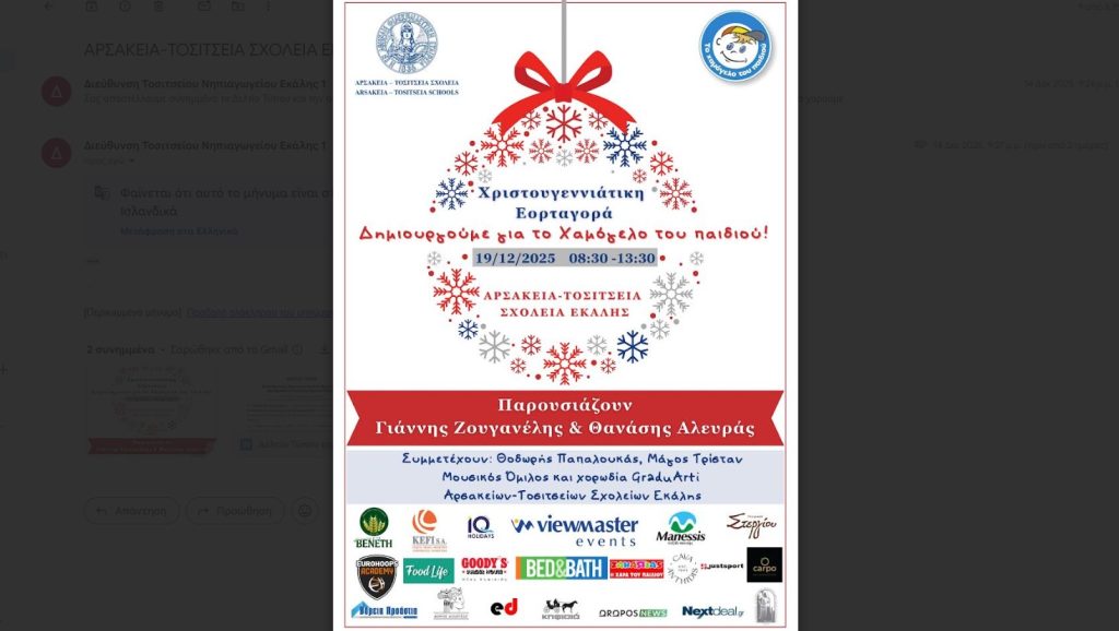 Μια μεγάλη δράση κοινωνικής προσφοράς διοργανώνουν την Παρασκευή 19 Δεκεμβρίου τα Αρσάκεια–Τοσίτσεια Σχολεία Εκάλης, με τη Φιλανθρωπική Χριστουγεννιάτικη Εορταγορά 2025, που θα πραγματοποιηθεί από τις 8.30 έως τις 13.30, με στόχο την ενίσχυση του οργανισμού «Το Χαμόγελο του Παιδιού».
