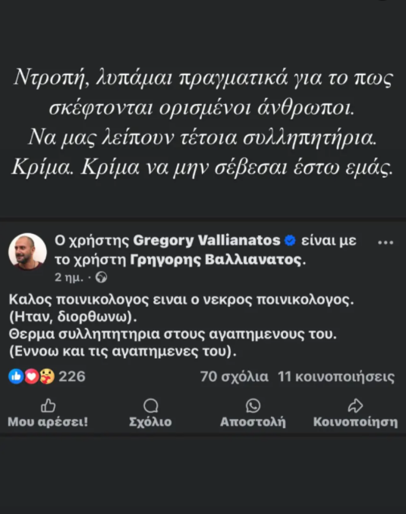 Μετά τις έντονες αντιδράσεις που προκάλεσε η ανάρτησή του για τον Αλέξη Κούγια, καθώς και το δημόσιο ξέσπασμα του γιου του γνωστού ποινικολόγου που «έφυγε» από τη ζωή, ο Γρηγόρης Βαλλιανάτος επανήλθε με νέα δημοσίευση.