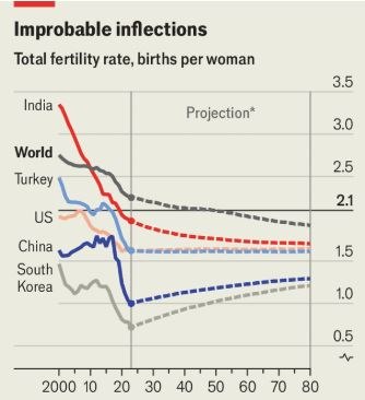 Ωστόσο, δεν είναι καθόλου σαφές ότι ο κόσμος είναι προορισμένος να ακολουθήσει αυτό το παράδειγμα και, σε κάθε περίπτωση, τα ποσοστά γεννήσεων στα περισσότερα μέρη που φαινόταν γόνιμα μειώνονται και πάλι.