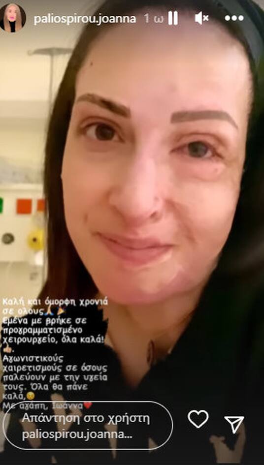«Καλή και όμορφη χρονιά σε όλους. Εμένα με βρήκε σε προγραμματισμένο χειρουργείο όλα καλά. Αγωνιστικούς χαιρετισμούς σε όσους παλεύουν με την υγεία τους όλα θα πάνε καλά. Με αγάπη Ιωάννα», έγραψε η Ιωάννα αναρτώντας μια φωτογραφία μέσα από το νοσοκομείο.