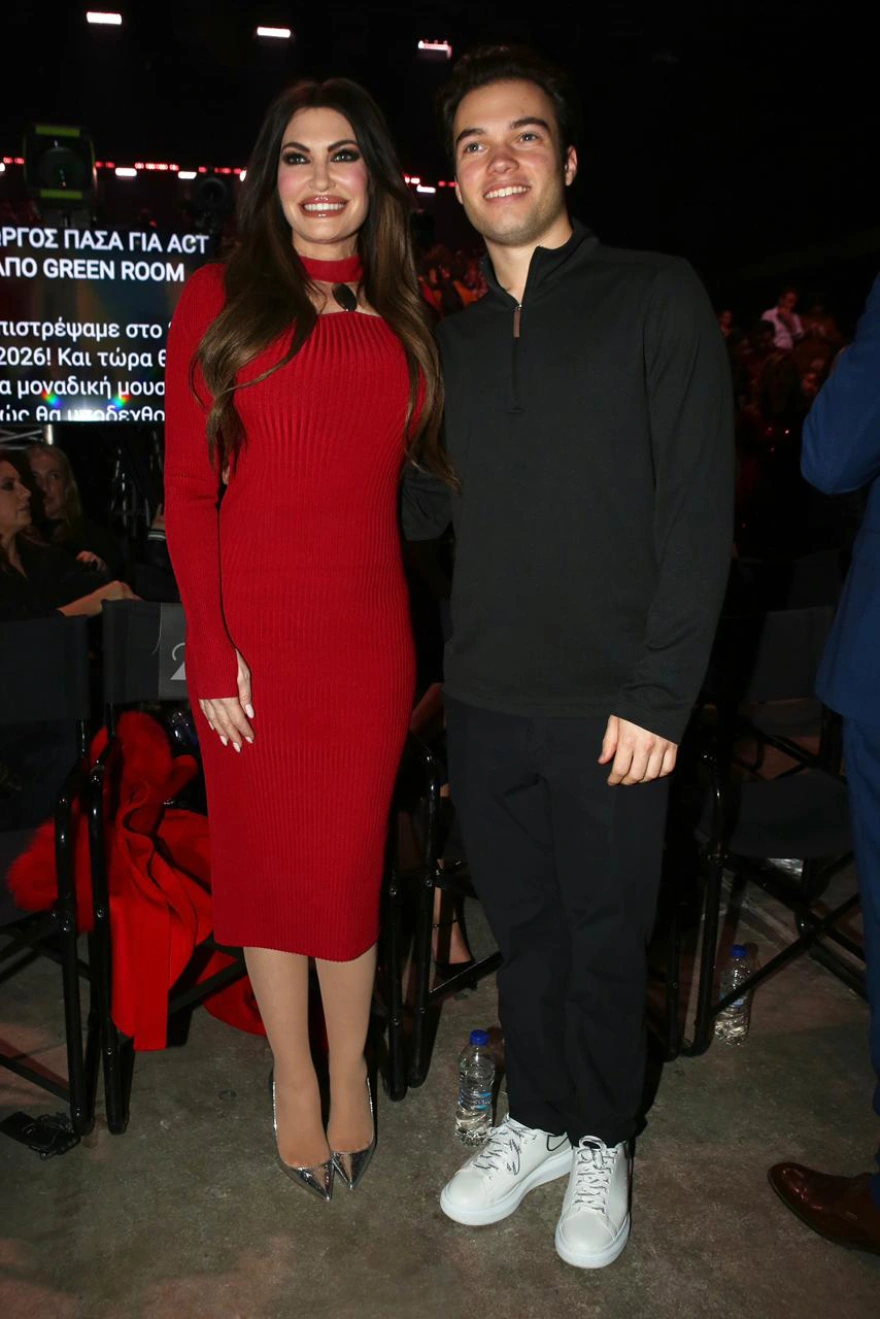 Η Κίμπερλι Γκιλφόιλ συνοδευόμενη από τον γιο της Ρόναν, πόζαρε με κόκκινο μακρύ φόρεμα και ασημί γόβες, ενώ φωτογραφήθηκε και με τον πρόεδρο της ΕΡΤ, Γιάννη Παπαδόπουλο.