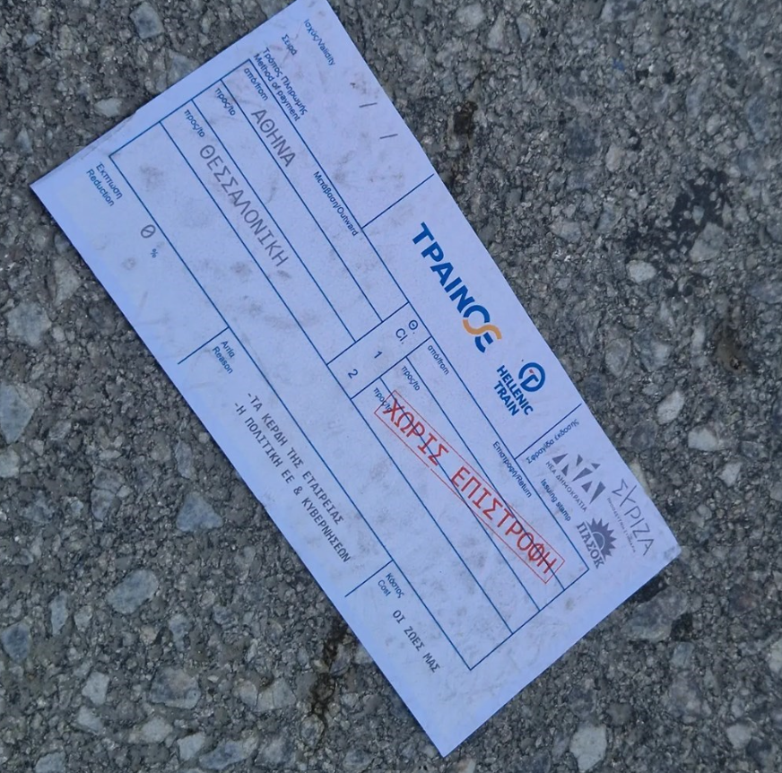 Οι διαδηλωτές πέταξαν στους δρόμους τυπωμένα εισιτήρια της Hellenic Train, για τη διαδρομή Αθήνα – Θεσσαλονίκη, πάνω στα οποία υπήρχε η ένδειξη «Χωρίς επιστροφή», με κεφαλαία κόκκινα γράμματα.