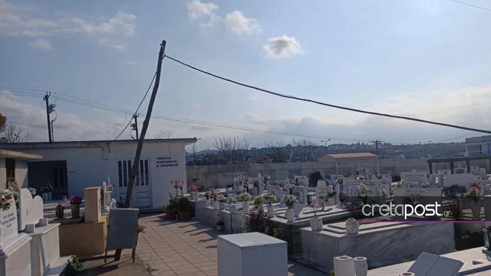 Σύμφωνα με πληροφορίες του cretapost, ένας στύλος της ΔΕΗ έπεσε με αποτέλεσμα να προκληθούν καταστροφές στα μνήματα.