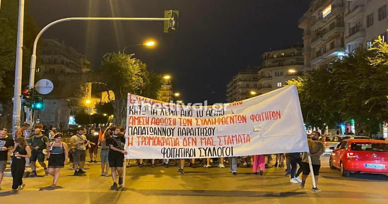 Νέα πορεία διαμαρτυρίας πραγματοποιείται στη Θεσσαλονίκη, από άτομα του αντιεξουσιαστικου χώρου και μέλη συλλογικοτήτων, μετά τα σοβαρά επεισόδια που σημειώθηκαν τα ξημερώματα του Σαββάτου στο Αριστοτέλειο Πανεπιστήμιο και στο κέντρο της πόλης.