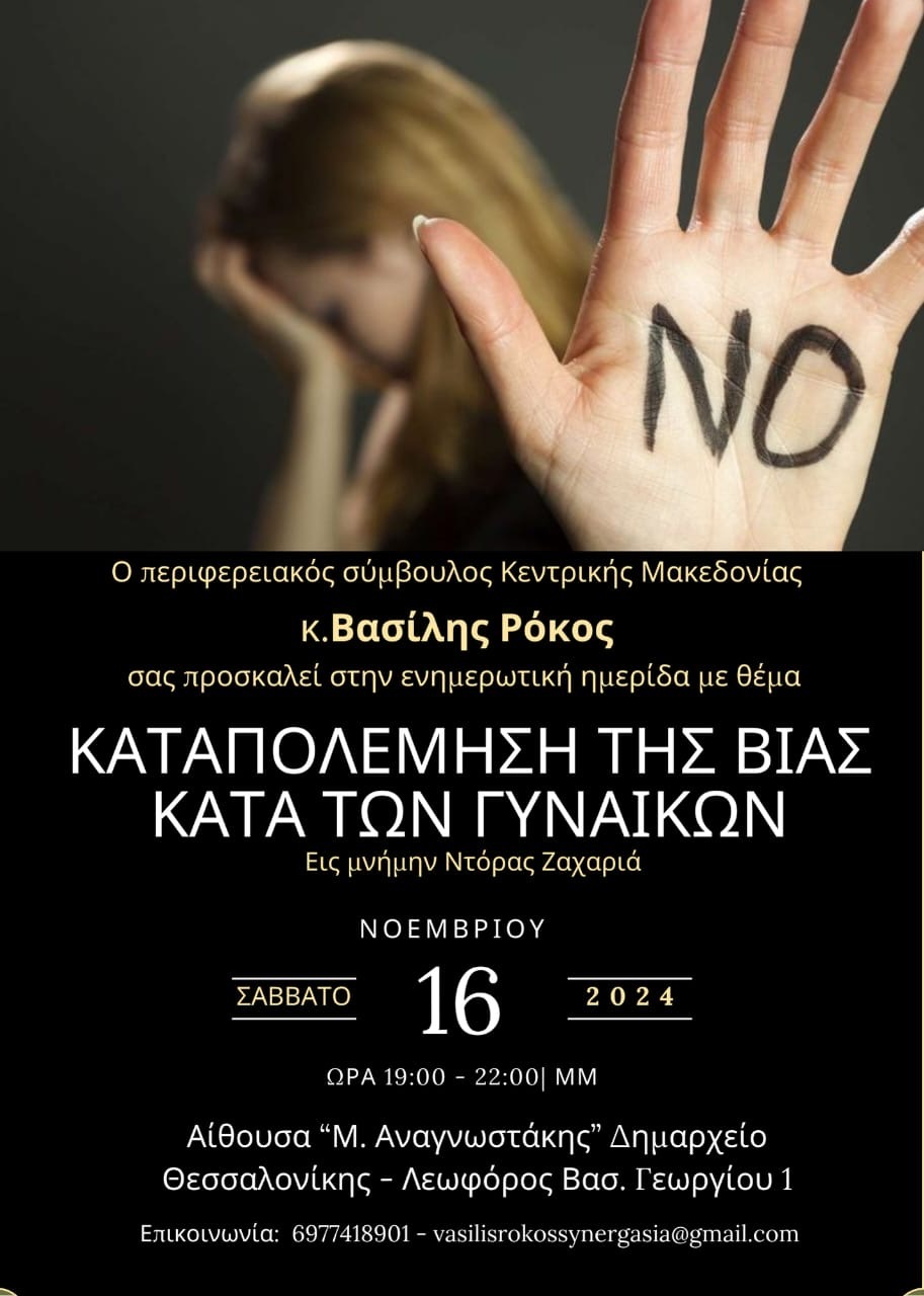 Εις μνήμην της Ντόρας Ζαχαριά και όλων των Ελληνίδων γυναικών που έπεσαν θύματα γυναικοκτονίας και με αφορμή την επικείμενη Παγκόσμια Ημέρα Κατά της Βίας των Γυναικών (25/11), ο περιφερειακός σύμβουλος Κεντρικής Μακεδονίας κ. Βασίλης Ρόκος διοργανώνει ενημερωτική ημερίδα με θέμα την «Καταπολέμηση της βίας κατά των γυναικών».