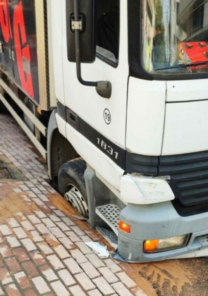 Ιδιωτικό φορτηγό όχημα ακινητοποιήθηκε και «βούλιαξε» στην άσφαλτο, όταν το οδόστρωμα υποχώρησε ξαφνικά λόγω εκτεταμένης διαρροής από το δίκτυο της ΕΥΔΑΠ.