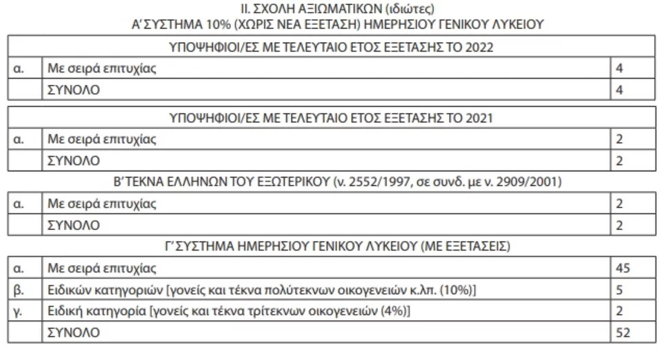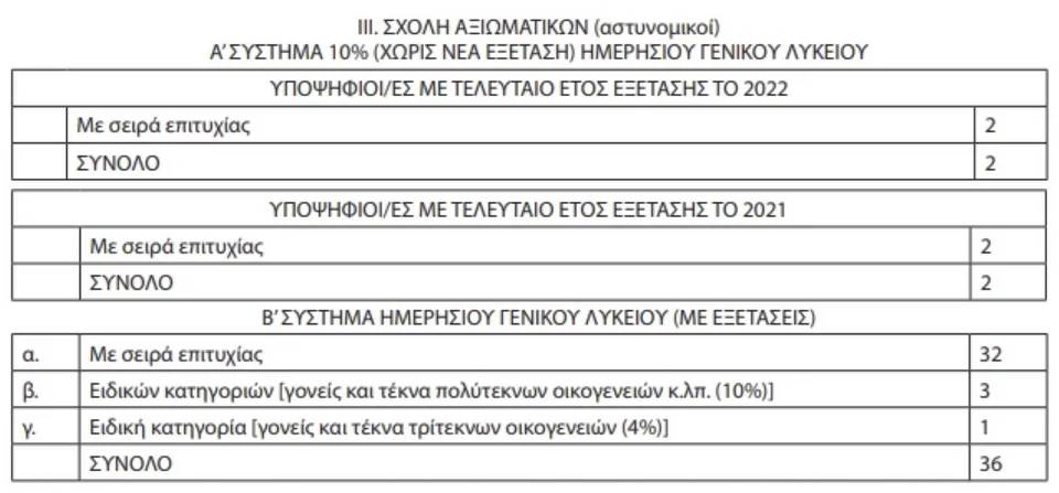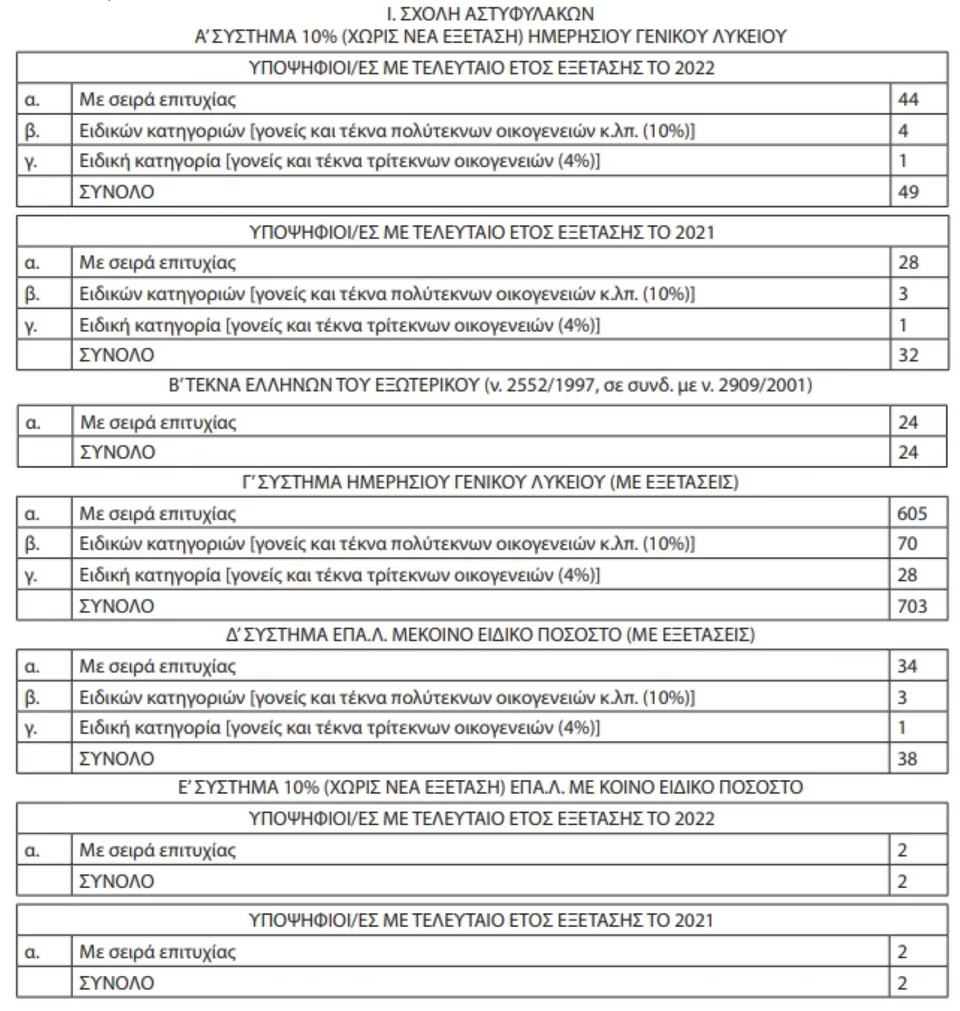 Όπως τονίζεται στην απόφαση, ο αριθμός των υποψηφίων που θα εισαχθούν στις Σχολές Αστυφυλάκων και Αξιωματικών της Ελληνικής Αστυνομίας κατά το ακαδημαϊκό έτος 2023-2024, ύστερα από τη συμμετοχή τους στις Πανελλήνιες εξετάσεις του σχολικού έτους 2022-2023, καθορίζεται σε οκτακόσιους πενήντα (850) και σε εκατό (100), αντιστοίχως.