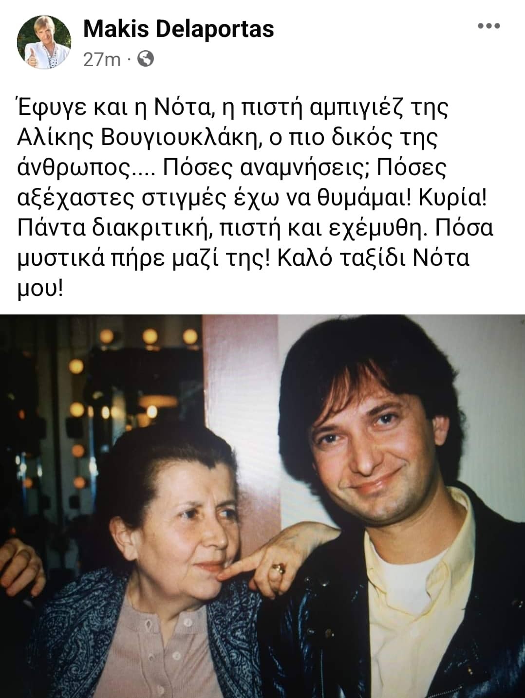 «Έφυγε και η Νότα, η πιστή αμπιγιέζ της Αλίκης Βουγιουκλάκη… ο πιο δικός της άνθρωπος… πόσες αναμνήσεις; Πόσες αξέχαστες στιγμές έχω να θυμάμαι! Κυρία! Πάντα διακριτική, πιστή και εχέμυθη! Πόα μυστικά πήρε μαζί της… καλό ταξίδι Νότα μου», έγραψε ο ίδιος.