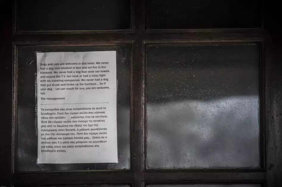 Ειδικότερα, στην πόρτα εισόδου της επιχείρησης, ο ιδιοκτήτης κόλλησε το σημείωμα που καλωσορίζει τα σκυλάκια και τα γατάκια γράφοντας στην ελληνική και την αγγλική γλώσσα: «Τα κατοικίδιά σας είναι ευπρόσδεκτα σε αυτό το ξενοδοχείο. Ποτέ δεν είχαμε σκύλο που κάπνισε πάνω στο κρεβάτι καίγοντας έτσι τα σεντόνια.