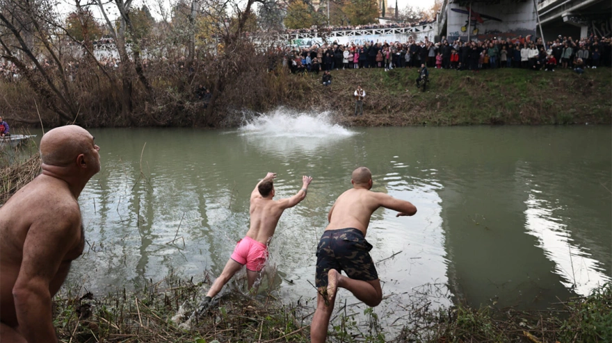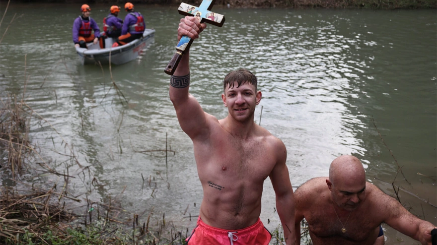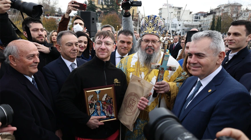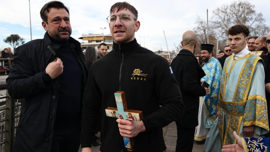 Ο 21χρονος Στέργιος Παγωνίδης ήταν αυτός που έπιασε πρώτος τον Τίμιο Σταυρό στην τελετή καθαγιασμού των υδάτων στην Α’ προβλήτα του λιμανιού Θεσσαλονίκης.
