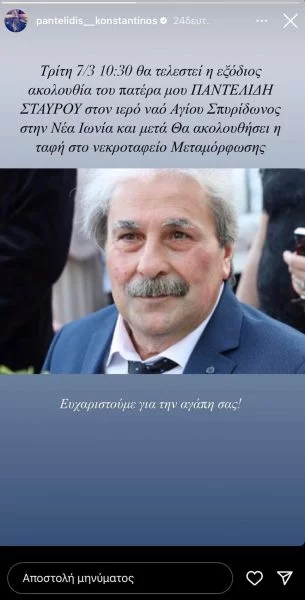 «Τρίτη 7/3 10:30 θα τελεστεί η εξόδιος ακολουθία του πατέρα του Παντελίδη Σταύρου στον ιερό ναό Αγίου Σπυρίδωνος στη Νέα Ιωνία και μετά θα ακολουθήσει η ταφή στο νεκροταφείο Μεταμόρφωσης. Ευχαριστούμε για την αγάπη σας», έγραψε ο Κωνσταντίνος Παντελίδης.