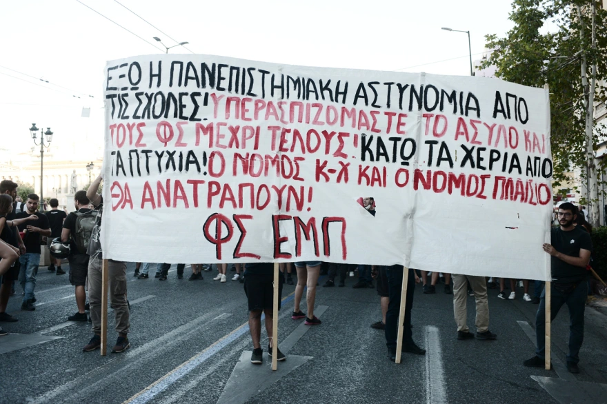 Νέα πορεία διαμαρτυρίας ενάντια στην πανεπιστημιακή αστυνομία, διεξάγεται, αυτήν τη φορά έξω από τα Προπύλαια. Φοιτητές έχουν συγκεντρωθεί και φωνάζουν συνθήματα κατά της αστυνομίας, λίγες ώρες μετά τις κινητοποιήσεις στην Πανεπιστημιούπολη, στου Ζωγράφου.