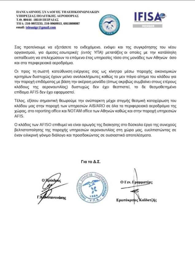 Οι επαγγελματίες στον κλάδο των τηλεπικοινωνιών, κατηγορούν την διοίκηση του αεροδρομίου και το υπουργείο Μεταφορών ότι «κωφεύουν στις συνεχείς εκκλήσεις του Συλλόγου για ενίσχυση του κλάδου». Με επιστολή που στέλνουν στον διοικητή ΥΠΑ, κάνουν λόγο για «εργασιακό μεσαίωνα» και ζητούν ενίσχυση και επάνδρωση του κλάδου AFISO.