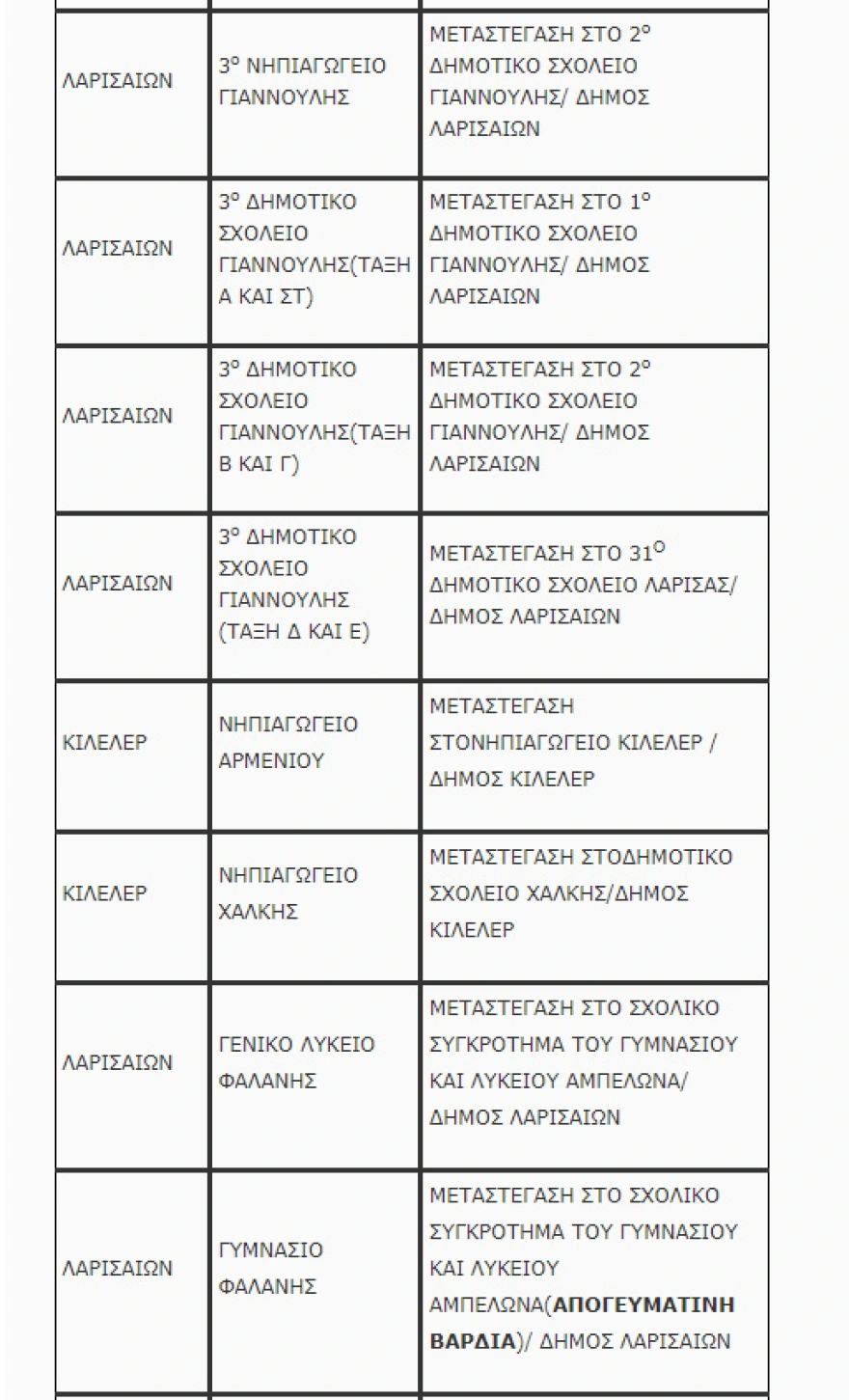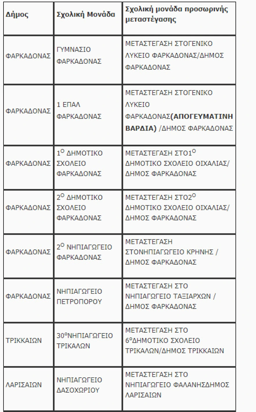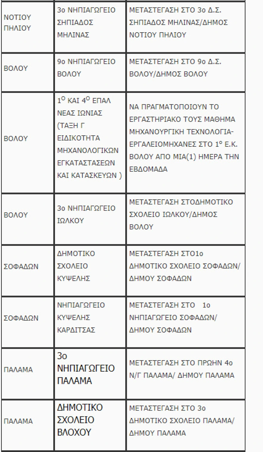 Α. Θα μεταστεγαστούν προσωρινά σε κτίρια σχολικών μονάδων στον ίδιο ή σε όμορους δήμους και σε πρωινή βάρδια (εκτός δύο περιπτώσεων όπου ρητώς αναφέρεται απογευματινή βάρδια) οι παρακάτω σχολικές μονάδες ή τάξεις σχολικών μονάδων: