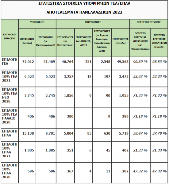 Συνολικά εισήχθησαν στα Πανεπιστήμια, στις Ανώτατες Εκκλησιαστικές Ακαδημίες, στην ΑΣΠΑΙΤΕ, στην ΑΣΤΕ, στις Στρατιωτικές και Αστυνομικές Σχολές και στις Ακαδημίες της Πυροσβεστικής, του Εμπορικού Ναυτικού και του Λιμενικού Σώματος 61.682 υποψήφιοι ΓΕΛ και ΕΠΑΛ.