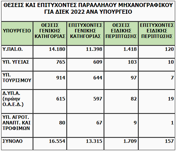 Τα αναλυτικά στοιχεία υποψηφίων και επιτυχόντων ανά Υπουργείο παρατίθενται στον συνημμένο πίνακα.