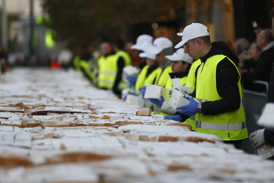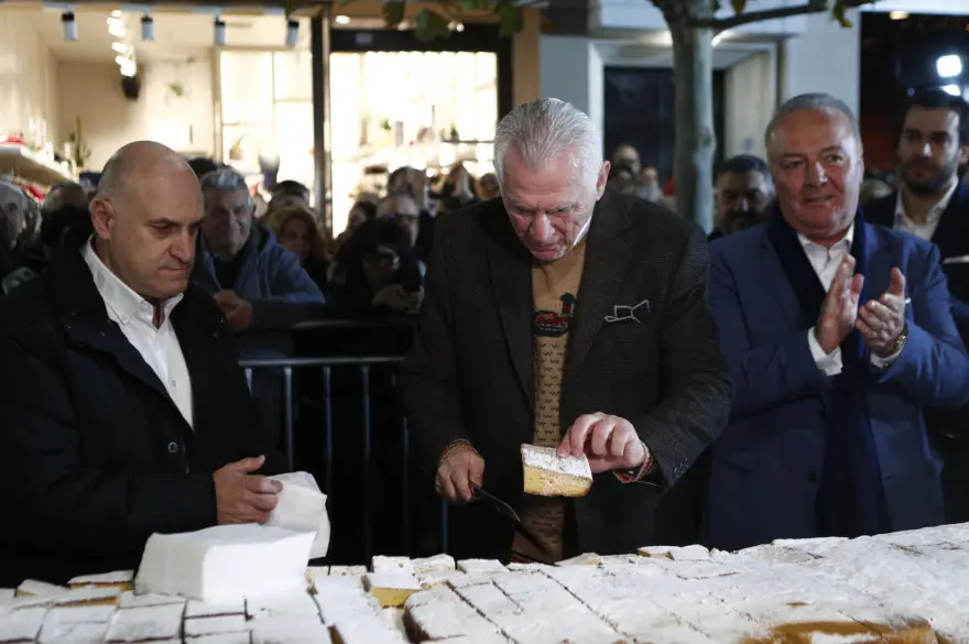 Στην πλατεία Δημαρχείου στο Περιστέρι εμφανίστηκε βασιλόπιτα για ρεκόρ Γκίνες η οποία ζυγίζει πάνω από 10 τόνους και μετρά πάνω από 70.000 κομμάτια.