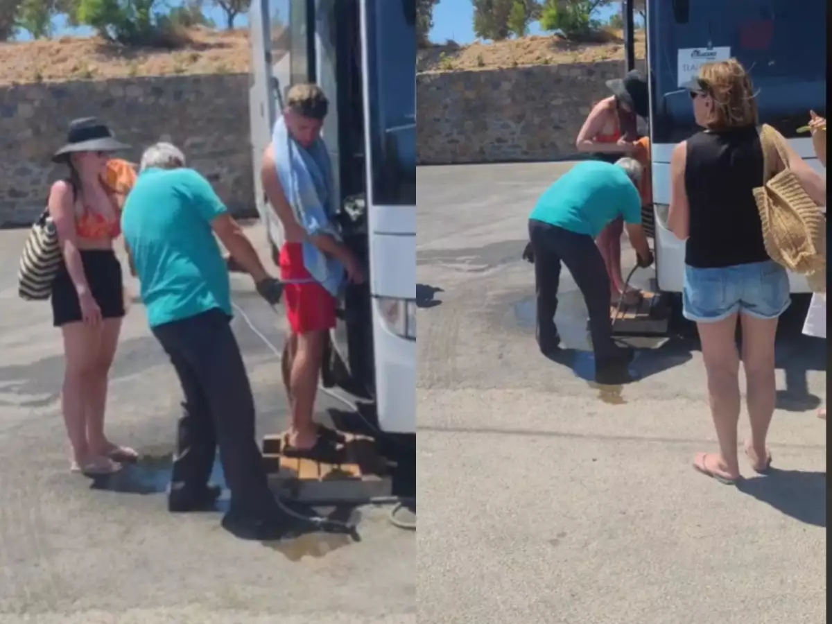 Βίντεο που δημοσιεύθηκε στο TikTok, δείχνει έναν οδηγό του ΚΤΕΛ στην Κρήτη ο οποίος καθαρίζει με το… λάστιχο τους τουρίστες πριν επιβιβαστούν.