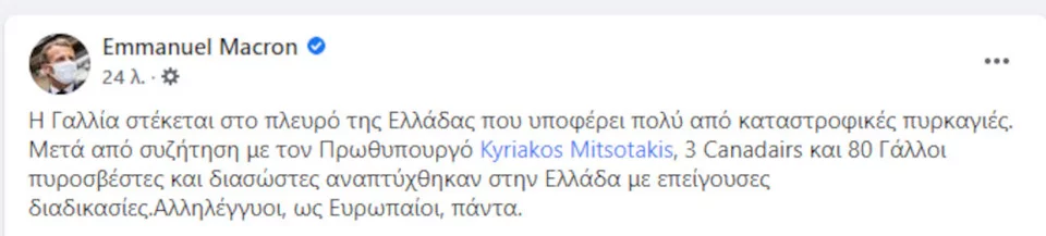 Με ανάρτησή του στο Facebook, ο Εμανουέλ Μακρόν αναφέρθηκε στη συζήτηση που είχε με τον Έλληνα πρωθυπουργό, προσθέτοντας ότι η χώρα του έχει στείλει 3 καναντέρ και 80 Γάλλους πυροσβέστες.
