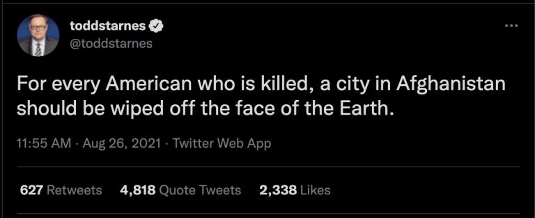 Ο Αμερικανός παρουσιαστής Τοντ Στάρνς μέσα από ανάρτησή του στα social media ζητά την καταστροφή μιας αφγανικής πόλης για κάθε Αμερικανό που σκοτώθηκε μετά την επίθεση στην Καμπούλ.