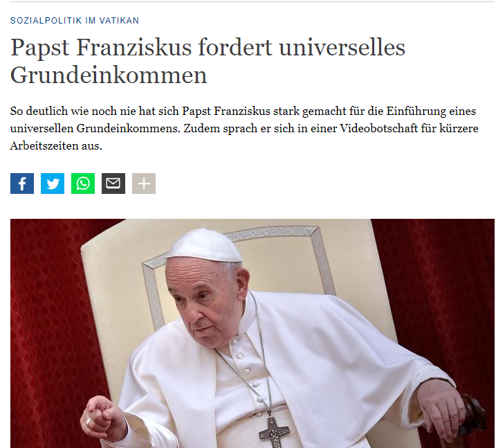 Μιλώντας, λοιπόν ο πάπας Φραγκίσκος στην τέταρτη παγκόσμια συνάντηση λαϊκών κινημάτων, είπε αναφερόμενο στο βασικό εισόδημα: «Πιστεύω ότι αυτά τα μέτρα είναι απαραίτητα» και ζήτησε λιγότερες ώρες εργασίας ώστε να υπάρχει δουλειά για όλους.