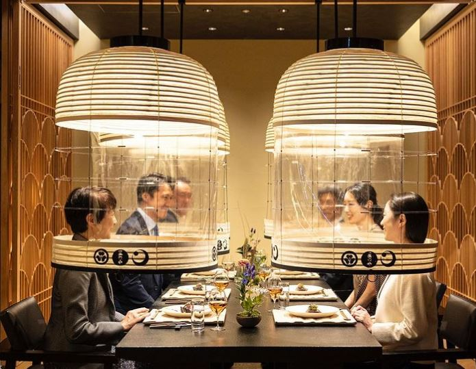 Τα κατά παραγγελία κατασκευασμένα φανάρια αιωρούνται πάνω από το κεφάλι εκάστου συνδαιτημόνα, επιτρέποντάς του να βγάλει κατά τη διάρκεια του γεύματος την προστατευτική μάσκα του.
