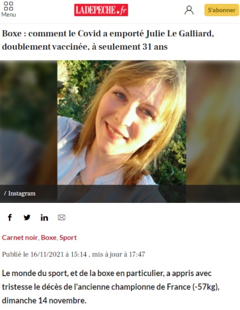 Η Γαλλίδα πρωταθλήτρια πυγμαχίας Julie Le Galliard μόλις στα τριάντα της, πέθανε την Κυριακή. Η αθλήτρια είχε εμβολιαστεί και με τις 2 δόσεις, σύμφωνα με τους συγγενείς της. Αλλά σύμφωνα με τη liberation που επιχειρεί ν’ απαντήσει σε μεγάλο μέρος της κοινής γνώμης που τη θεωρεί θύμα του εμβολίου, αιτία του θανάτου της ήταν η Covid σε συνδυασμό με την ανοσολογική της ανεπάρκεια(έπασχε από σπάνια ασθένεια του αναπανευστικού). Πάντως κι έτσι να είναι όπως τα λέει η γαλλική φυλλάδα η είδηση και πάλι είναι ότι η διπλά εμβολιασμένη αθλήτρια πέθανε από επιπλοκές κορωνοιού..