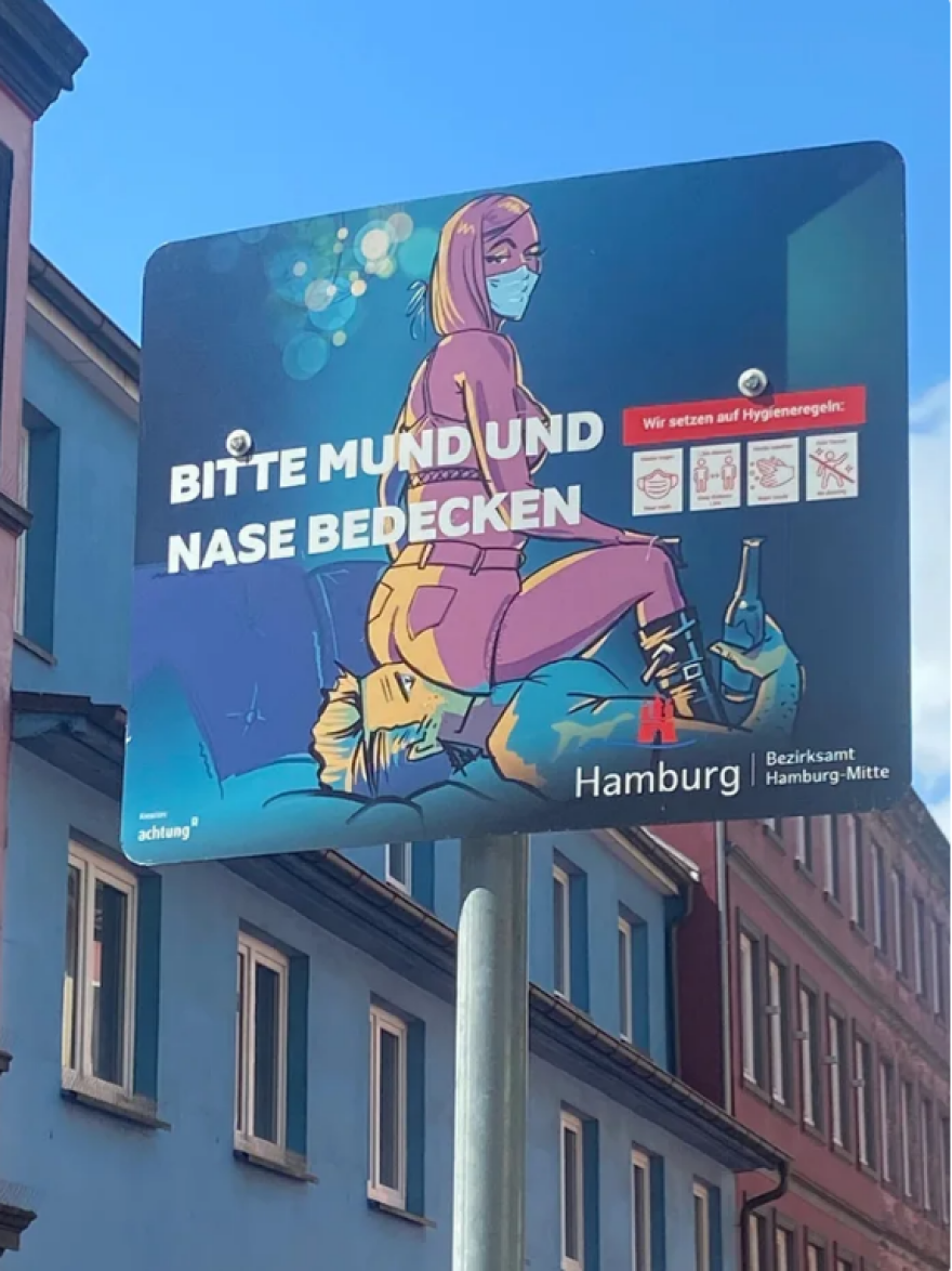 Συγκεκριμένα, μια ομάδα εστιατορίων της συνοικίας St. Pauli και το περιφερειακό γραφείο του Αμβούργου ανέπτυξαν μια ευφάνταστη καμπάνια με αφίσες όπου απεικονίζεται μια γυναίκα να κάθεται πάνω στο πρόσωπο ενός άνδρα, περνώντας με αυτόν τον ιδιαίτερο τρόπο στους πολίτες το μήνυμα ότι πρέπει να… καλύπτουν το στόμα και τη μύτη τους.