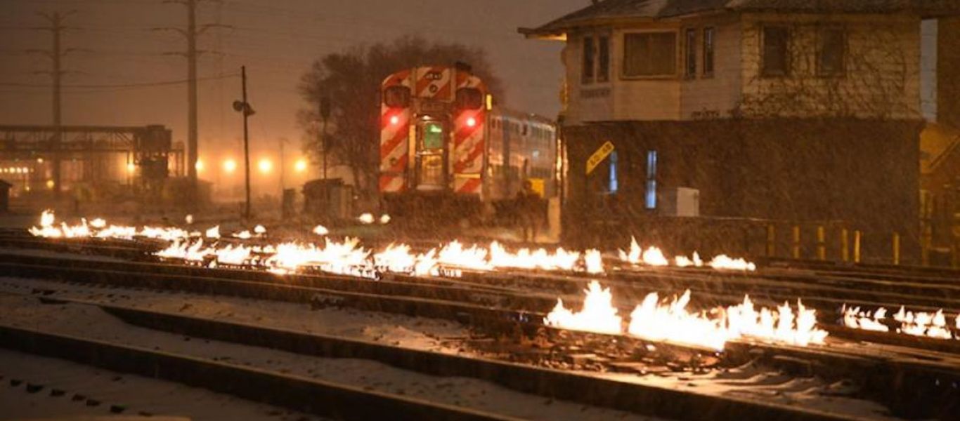Είναι μία απόφαση της διοίκησης του προαστιακού του Σικάγο τα τελευταία χρόνια, ώστε τους κρύους και παγωμένους μήνες να αποφεύγεται η διακοπή των δρομολογίων. Κρατάνε σε μία θερμοκρασία τις γραμμές ώστε να μπορούν να κινούνται τα τρένα, τα οποία όπως θα δείτε περνάνε κανονικά πάνω από τις φωτιές.