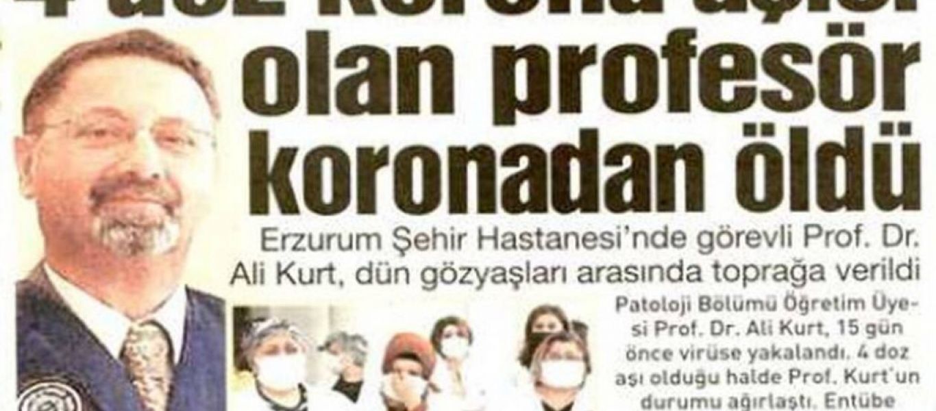 Ο τετραπλά εμβολιασμένος Τούρκος παθολόγος Αλί Κουρτ, που εργαζόταν στο νοσοκομείο της πόλης του Ερζερούμ στην ανατολική Τουρκία, πέθανε από πολυοργανική ανεπάρκεια εξαιτίας επιπλοκών της Covid-19, μεταδίδουν τουρκικά ΜΜΕ. Σύμφωνα με τα δημοσιεύματα, ο γιατρός νοσηλεύτηκε και κατέληξε στο νοσοκομείο όπου εργαζόταν.