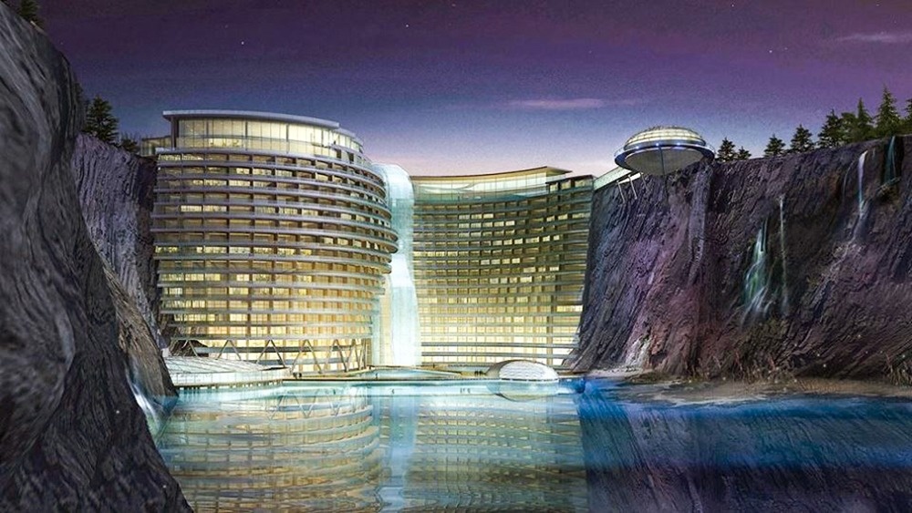 Πρόκειται για το νεότερο ξενοδοχείο στη Σαγκάη. Οι αρχιτέκτονες αποφάσισαν πως το εγκαταλελειμμένο λατομείο δε θα πρέπει να είναι άδειο και δημιούργησαν αυτά που βλέπετε στην εικόνα. Το ξενοδοχείο διαθέτει 328 δωμάτια, ορισμένα από τα οποία είναι ακόμη και κάτω από το νερό.