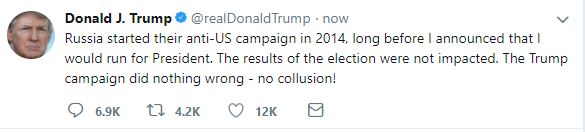 «Η Ρωσία ξεκίνησε την αντι-αμερικανική της καμπάνια το 2014, πολύ πριν ανακοινώσω την υποψηφιότητά μου για πρόεδρος», έγραψε στο twitter ο Αμερικανός πρόεδρος.