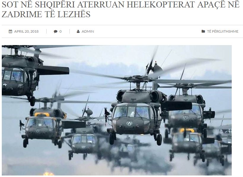 Σήμερα στην Αλβανία έφθασαν 33 ελικόπτερα Απάτσι στο Ζαντρίμε του Λέζα, για την προστασία τους σε καταφύγια, αναμένεται να έρθουν ακόμη 120 αεροσκάφη και τεθωρακισμένα οχήματα, σημειώνει το δημοσίευμα.