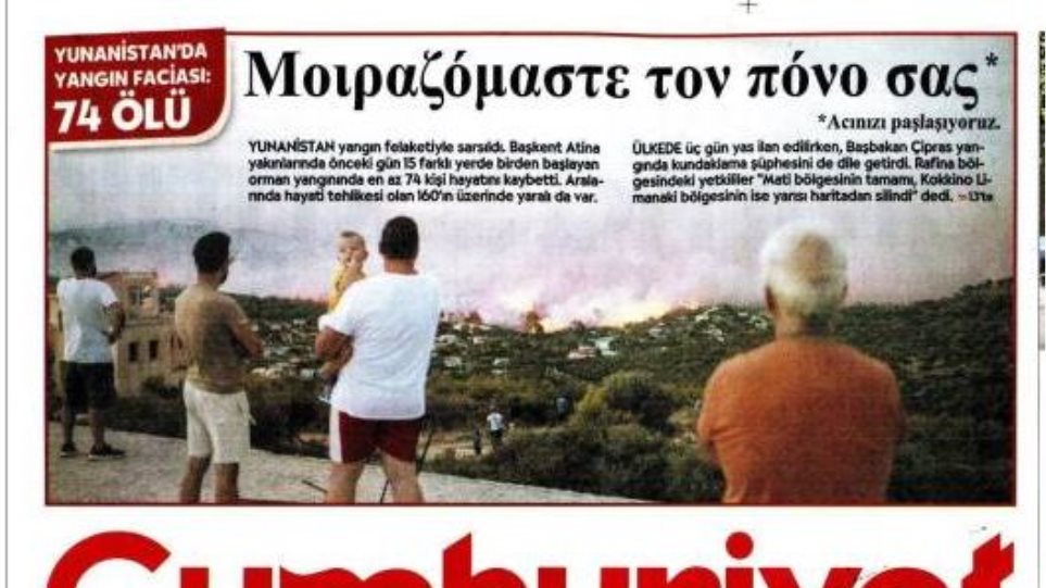 Συγκινητικό μήνυμα από την Cumhuriyet για τις φονικές φωτιές – Και στην κατεχόμενη Κύπρο εφημερίδα κυκλοφόρησε με πρωτοσέλιδο στα ελληνικά και τα τούρκικά