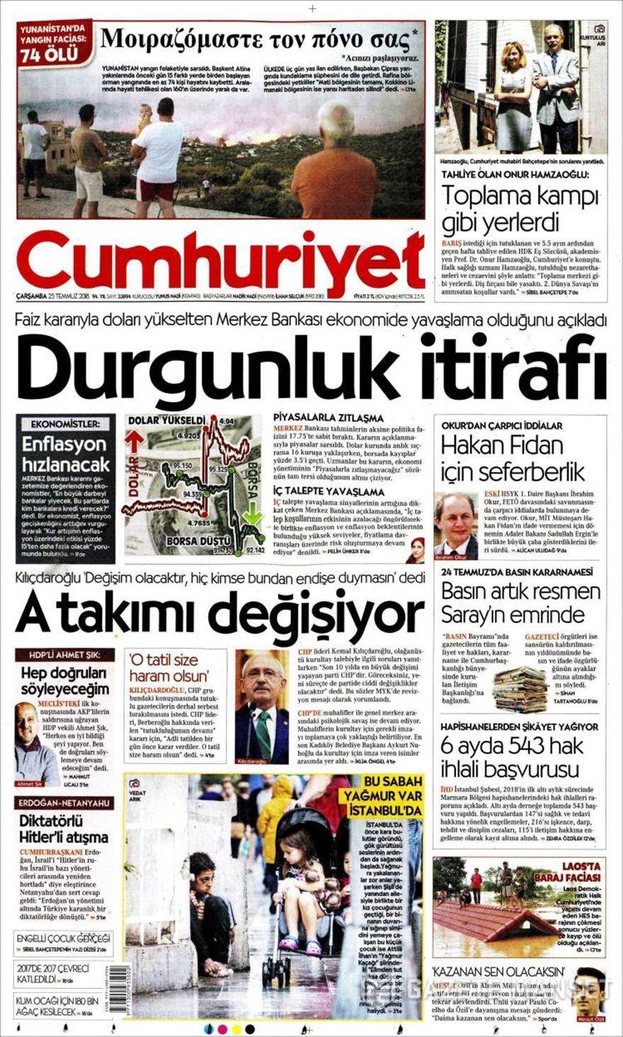 «Μοιραζόμαστε τον πόνο σας» είναι ο τίτλος του δημοσιεύματος που φιγουράρει στην πρώτη σελίδα του σημερινού φύλλου της Cumhuriyet, το οποίο αναφέρεται στην καταστροφή επικών διαστάσεων που προκάλεσαν οι πρόσφατες φωτιές.