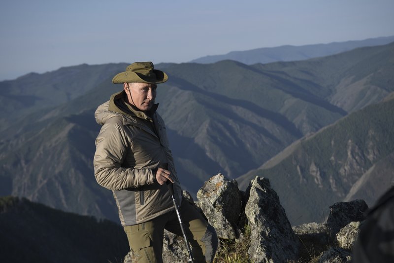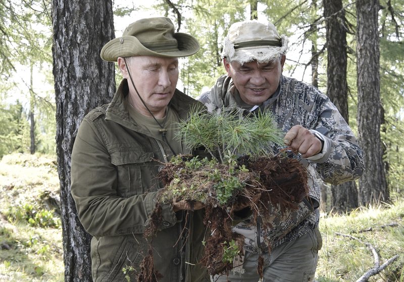 Στις φωτογραφίες που τραβήχτηκαν την Κυριακή και δημοσιεύτηκαν τη Δευτέρα από την υπηρεσία Τύπου του Κρεμλίνου, ο Βλαντίμιρ Πούτιν με χακί ρούχα κρατά ραβδί περιπάτου, κάθεται σε βράχο και ατενίζει τη θέα, ενώ σε άλλη είναι με τον υπουργό Αμυνας και κοιτούν ένα φυτό.