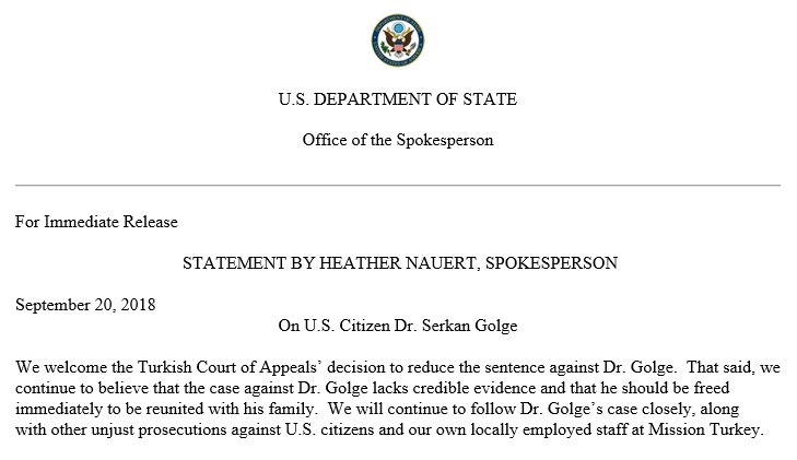 Αμέσως το Στέιτ Ντιπάρμεντ καλωσόρισε την είδηση με δήλωση της εκπροσώπου, Heather Nauert.