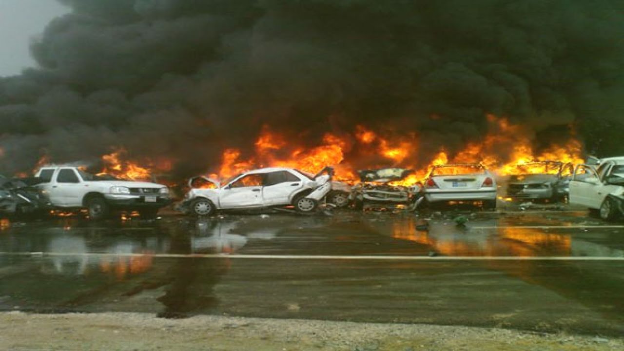 Εν μέσω χιονοθύελλας ο οδηγός καταγράφει το τροχαίο, όταν ένα από τα αυτοκίνητα εξερράγη. Τα συνεργεία χρειάστηκαν ώρες για να απομακρύνουν τα οχήματα και να αποκαταστήσουν την κυκλοφορία.