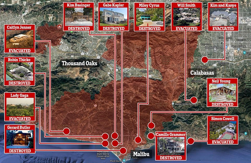 Τα σπίτια τους στην πυρκαγιά στο Μαλιμπού έχασαν η Μάιλι Σάιρους, ο Νιλ Γιανγκ, ο Τζέραρντ Μπάτλερ, ο Ρόμπιν Θικ, η Καμίλ Γκράμερ. Από τους ελάχιστους τυχερούς ήταν και ο Πιρς Μπρόσναν που ελάχιστα επλήγη το σπίτι του από τις φλόγες.